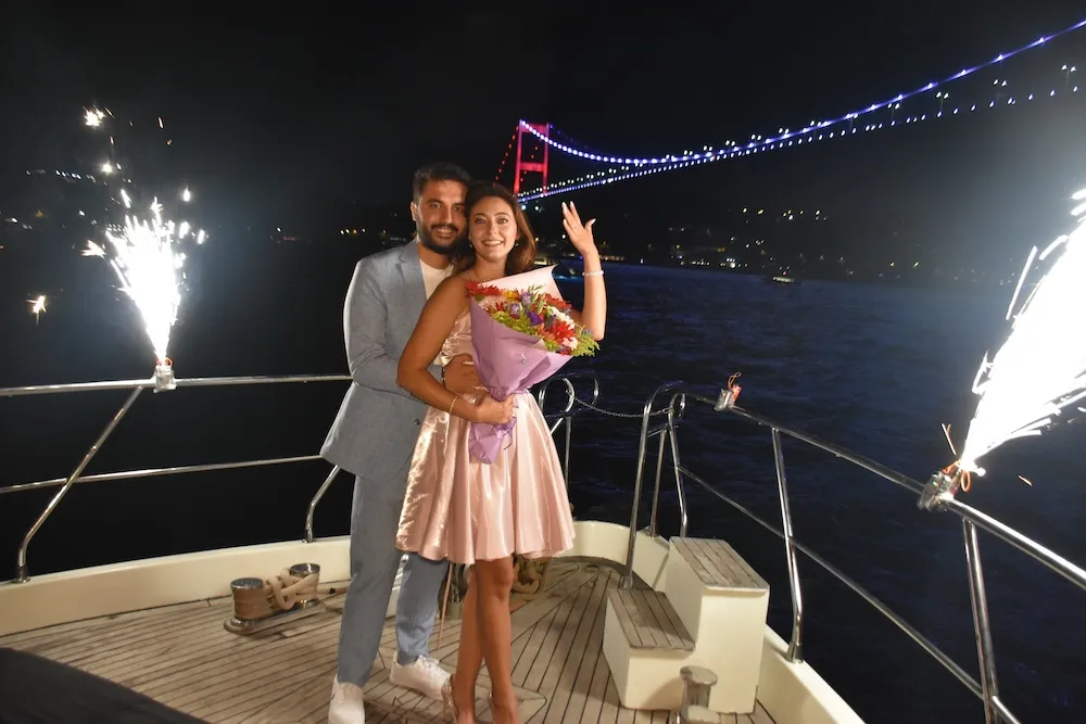 Özel bir yatta, köprünün tam altında süzülürken lazer gösterimiz başlar. Ardından, tam o büyük “Evet” cevabı geldiğinde gökyüzü adeta dile gelir. İstanbul Boğaz Köprüsü evlilik teklifi organizasyonlarımızda, köprü ışıklarıyla uyumlu havai fişekler patlar.